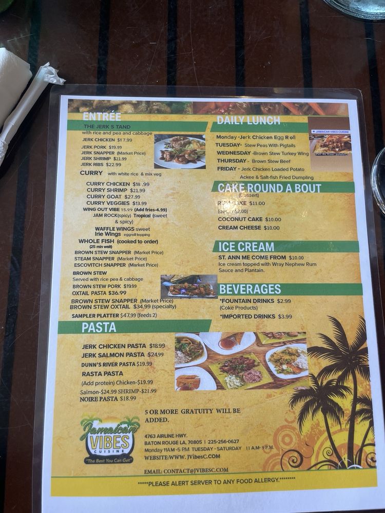 Introducing Jamaican Vibes Cuisine, a Caribbean restaurant located at 4763 Airline Hwy in Baton Rouge, LA. This classy establishment offers a variety of delicious dishes, including beef and chicken patties, jerk chicken egg rolls, loaded vibe mac, pon chicken, and tropical lettuce wraps for appetizers. For sandwich options, try the Feel The Rhythm or the Jerk Cheese Burger served with fries. The salad selection includes Jerk Chicken Caesar Salad, Nem Good Salad, and Salmon Salad. With wheelchair accessibility, outdoor seating, and catering services available, Jamaican Vibes Cuisine provides a welcoming atmosphere for all guests. Try the authentic flavors of Jamaica at this vibrant restaurant and experience a taste of the islands.